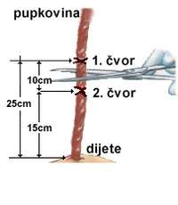 • Podvezivanje i presijecanje pupkovine nisu prioritetni postupci nakon porođaja. Djetetu će zapravo koristiti odgađanje ovih radnji jer će krv obogaćena kisikom nastaviti protjecati pupkovinom još nekoliko minuta nakon porođaja, dajući djetetu dodatni kisik dok uči samostalno disati. Ako dijete ne prodiše odmah, pupkovina mu je u tom periodu jedini opskrbljivač kisikom.